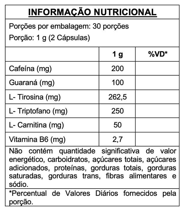 Ingredientes: L-Tirosina, L-Triptofano, Cafeína, Paullinia cupana, L Carnitina, Piridoxina, Lubrificante Estearato de Magnésio (INS 470iii) e Antiumectante Dióxido de Silício (INS 551). Cápsula: Gelatina Farmacêutica, Água Purificada e Corante.
