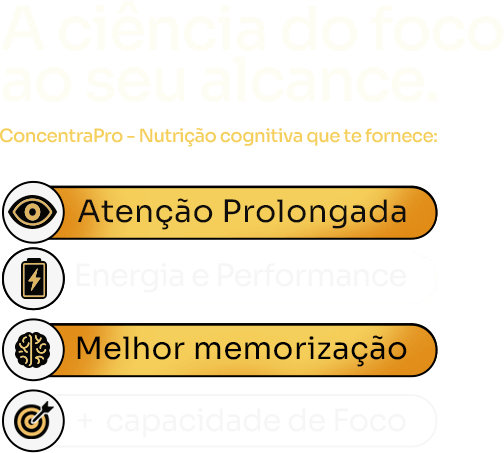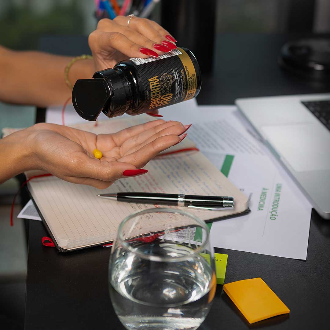 Para quem lida com decisões rápidas, reuniões e tarefas múltiplas, Concentra Pro mantém a clareza mental, energia e foco por longos períodos, mesmo em rotinas intensas, garantindo alto desempenho do início ao fim do dia.
