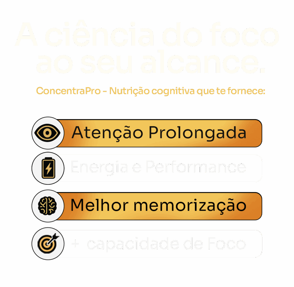 Para estudantes e concurseiros que enfrentam horas de leitura e memorização, Concentra Pro aumenta o foco, melhora a retenção e reduz a fadiga mental, ajudando você a aprender mais rápido e reter o conteúdo por muito mais tempo.